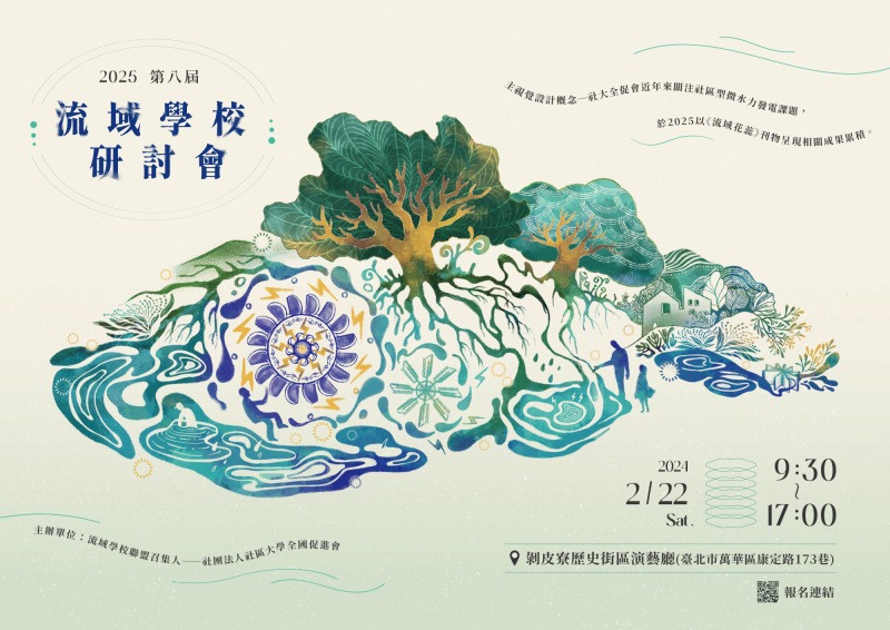 | 一年一度的流域學校研討會來了!本次邀請全台流域學校夥伴齊聚,分享今年度守護河溪的行動與經驗,今年第八屆研討會聚焦三大主軸:「夥伴分享與交流」、「回顧2024河川行動」以及「流域藝術」,透過豐富的專題講座與經驗分享,邀請您共同探討守護台灣河溪的多元行動與未來想像。本次研討會也將回顧2024年度的河川行動成果, 也歡迎對水環境、藝術或生態議題感興趣的夥伴一起參與。 活動對象:關心水議題的一般民眾與流域學校聯盟成員。議程:辦理時間:2025年2月22日(六)09:30-17:00辦理地點:剝皮寮歷史街區 演藝廳(臺北市萬華區康定路173巷) |